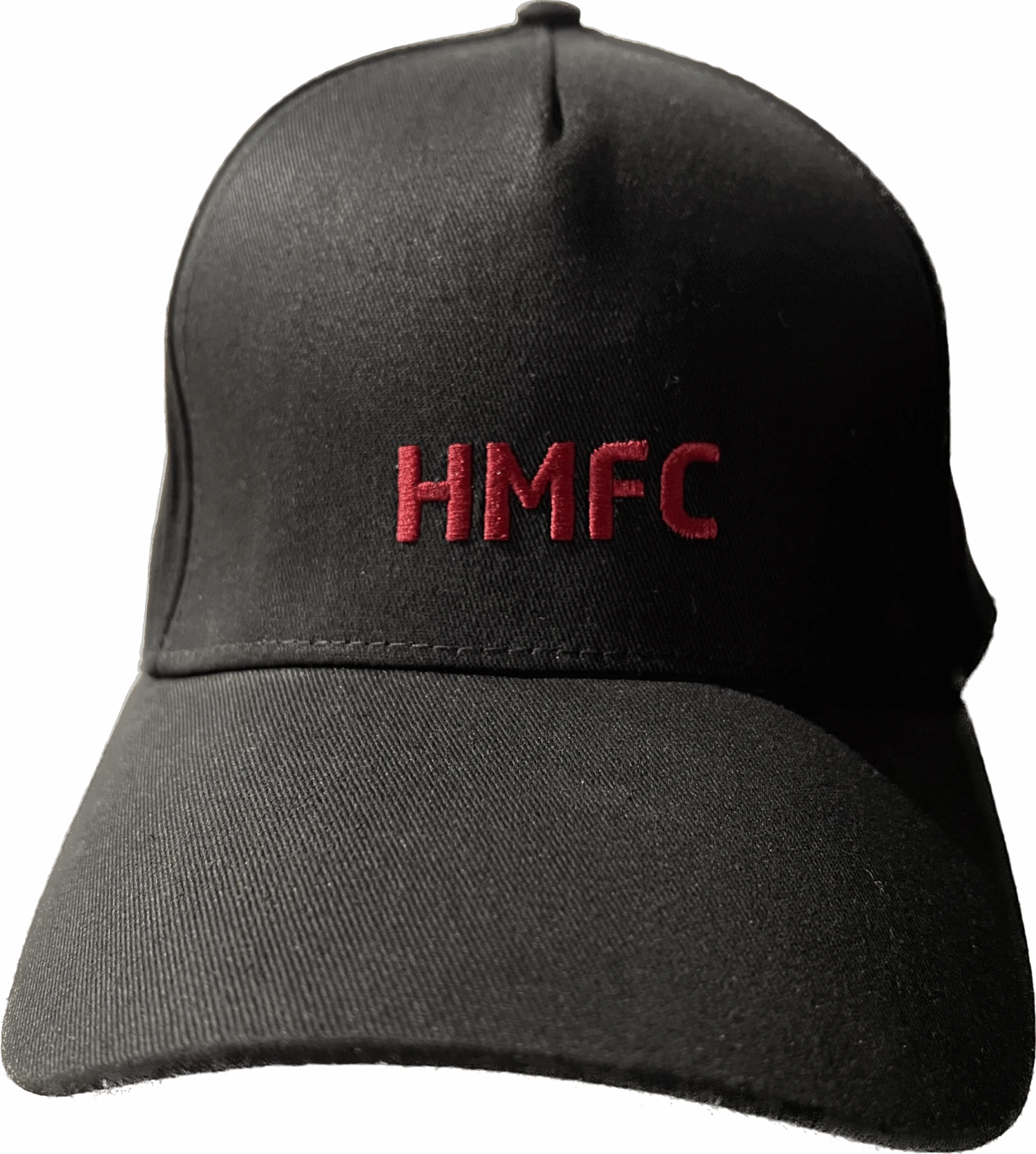 Black baseball cap with embroidered maroon HMFC lettering.