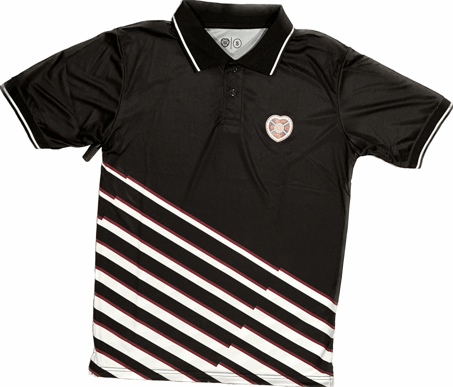 Black golf polo with maroon and white diagonal design.