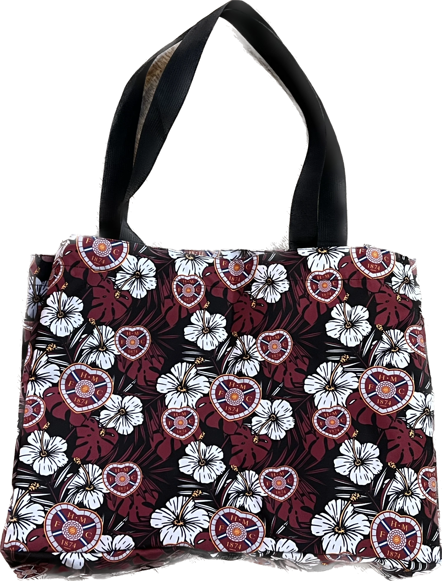 Black/ Maroon and white floral beach bag.