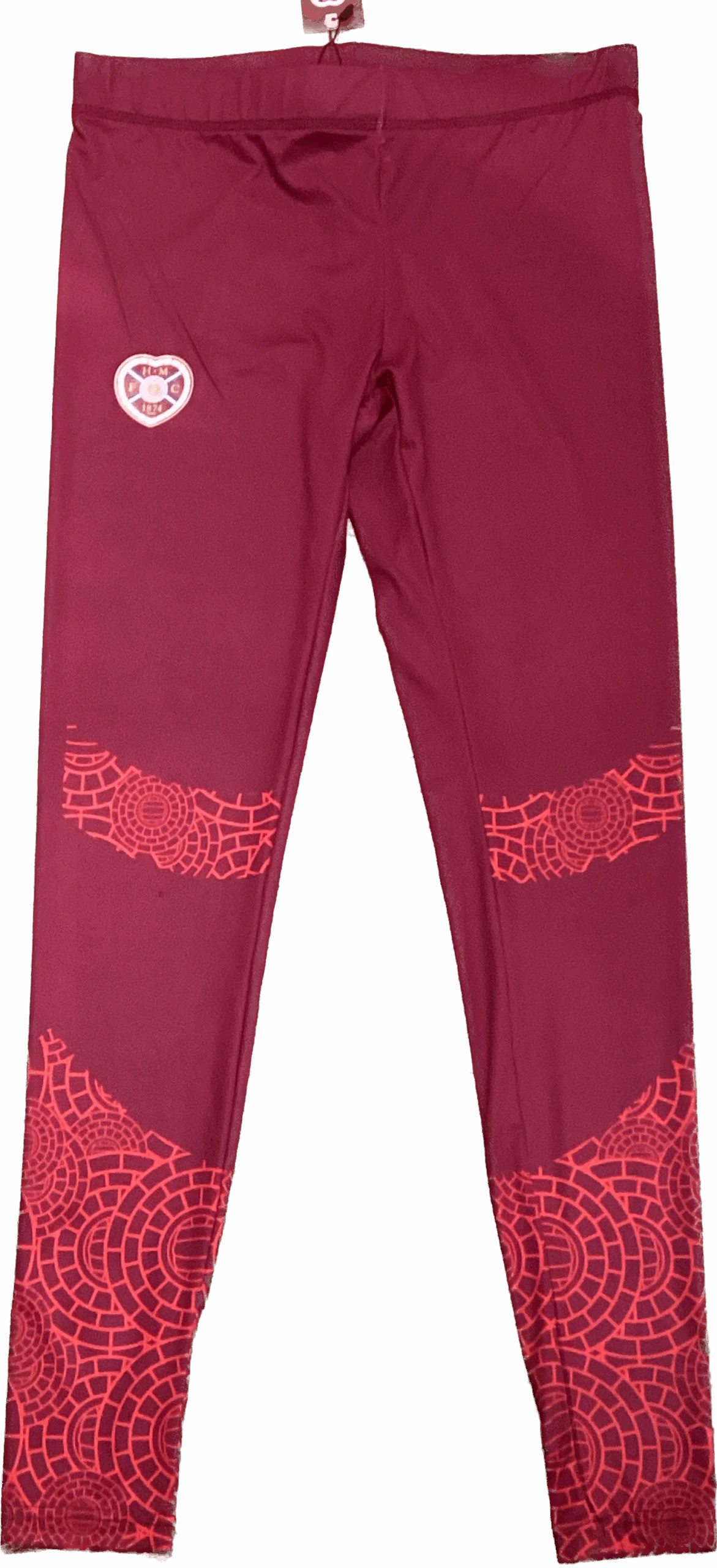 Maroon leggings with intricate central crest design on legs.