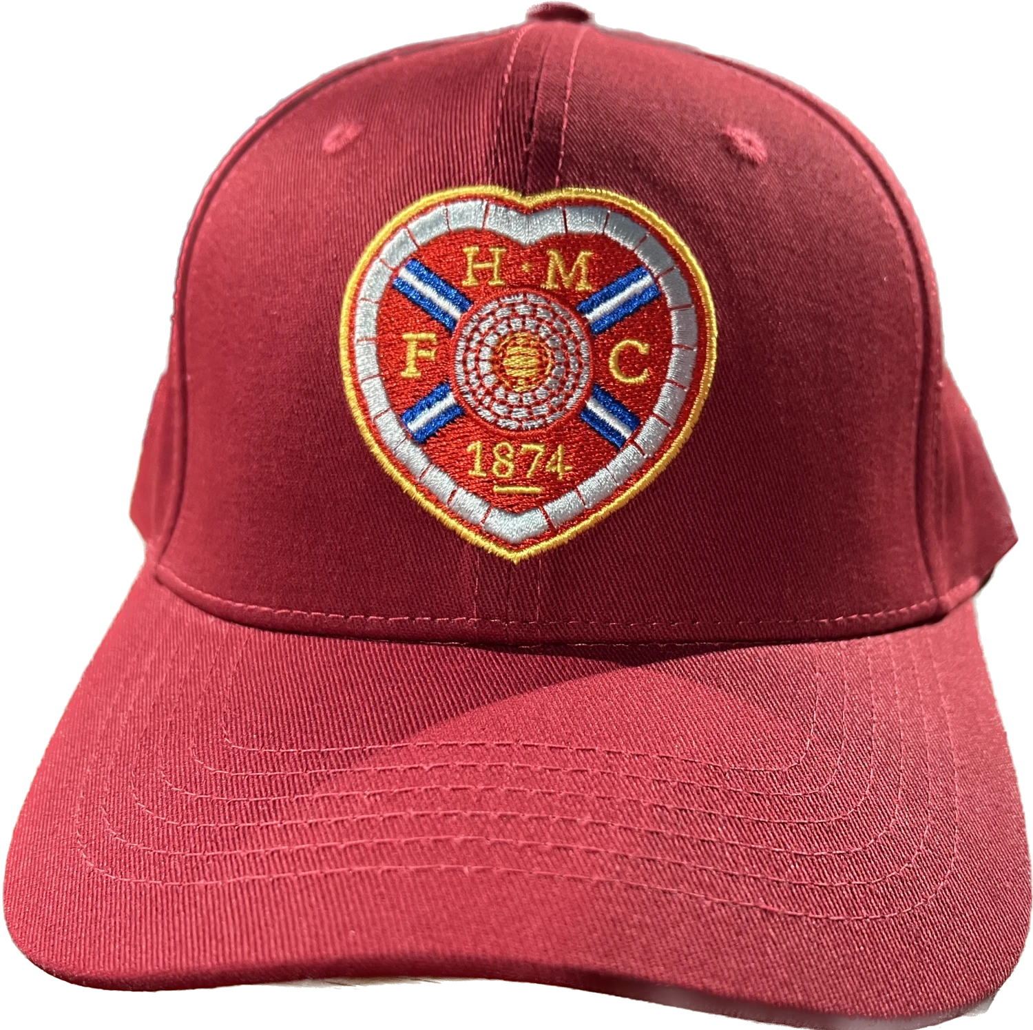 Maroon baseball cap with embroidered colored crest.